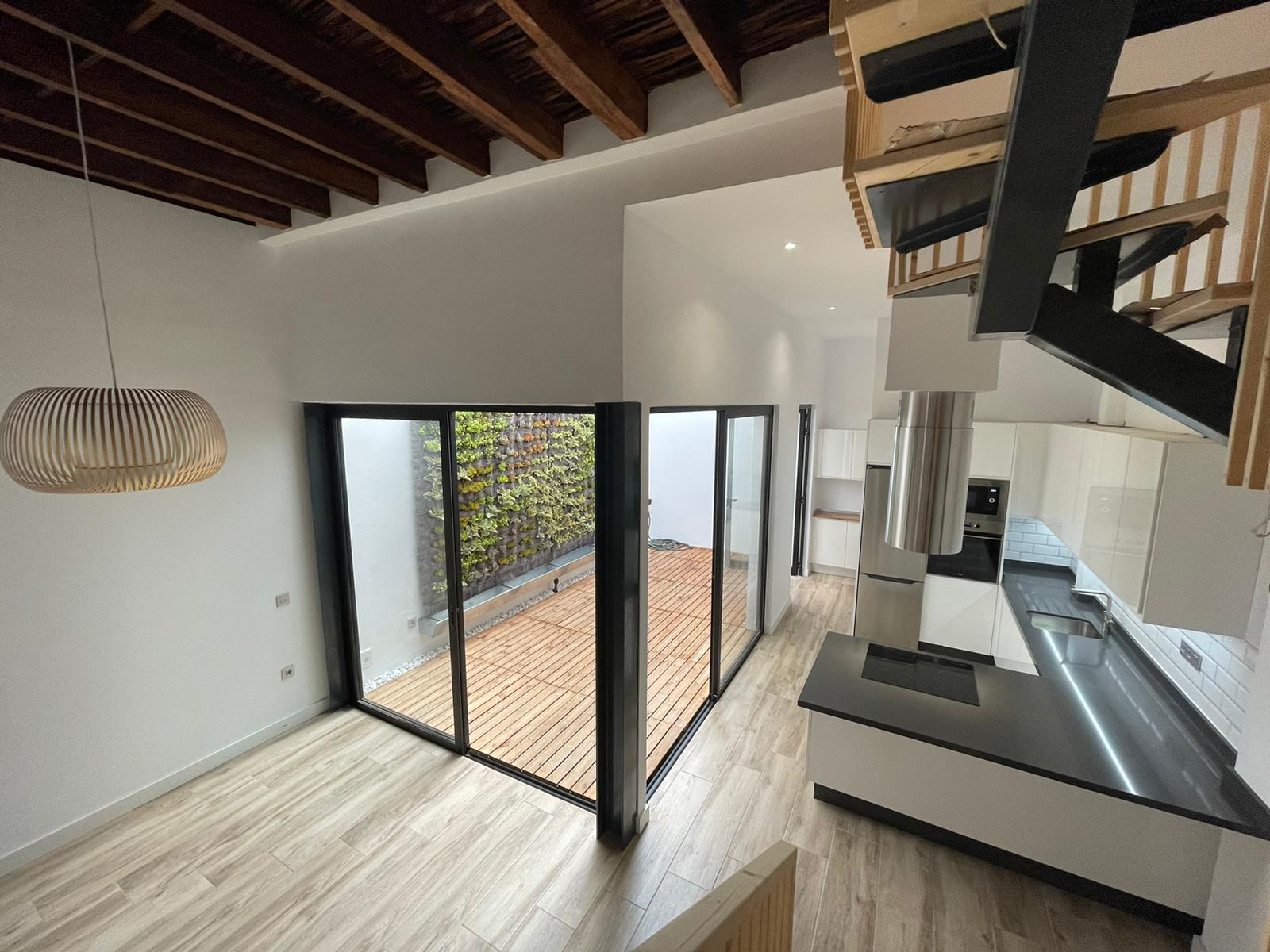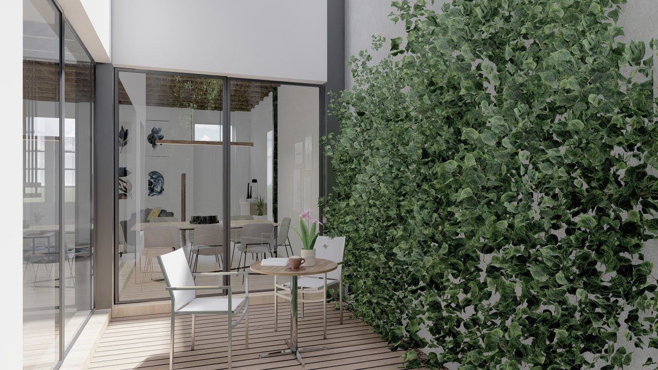 La escalera se centra como parte fundamental decorativa del espacio y deja enmarcada, junto con el patio de luz, la cocina. La presencia natural se propone por un jardín vertical que libera el espacio del patio de luz que funciona como terraza y comedor, gracias al buen clima de la ciudad. Las fachadas proporcionan intimidad a la vivienda, siendo el detalle de modernización, detalle y contrate de la fachada original rehabilitada.