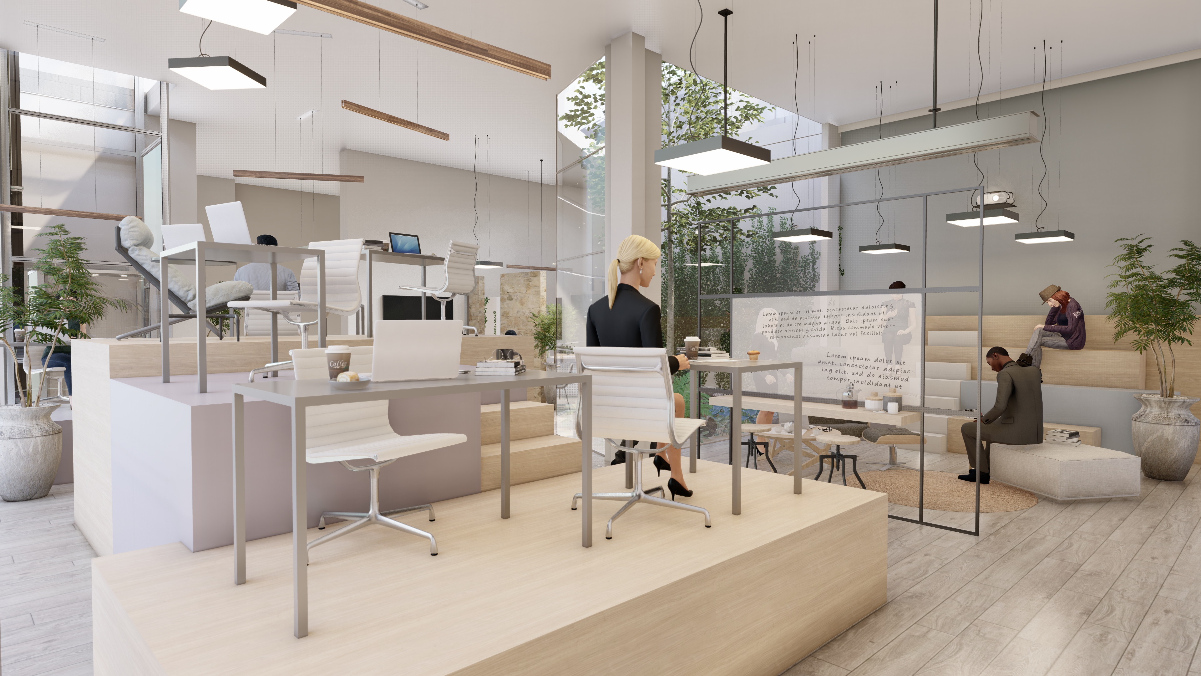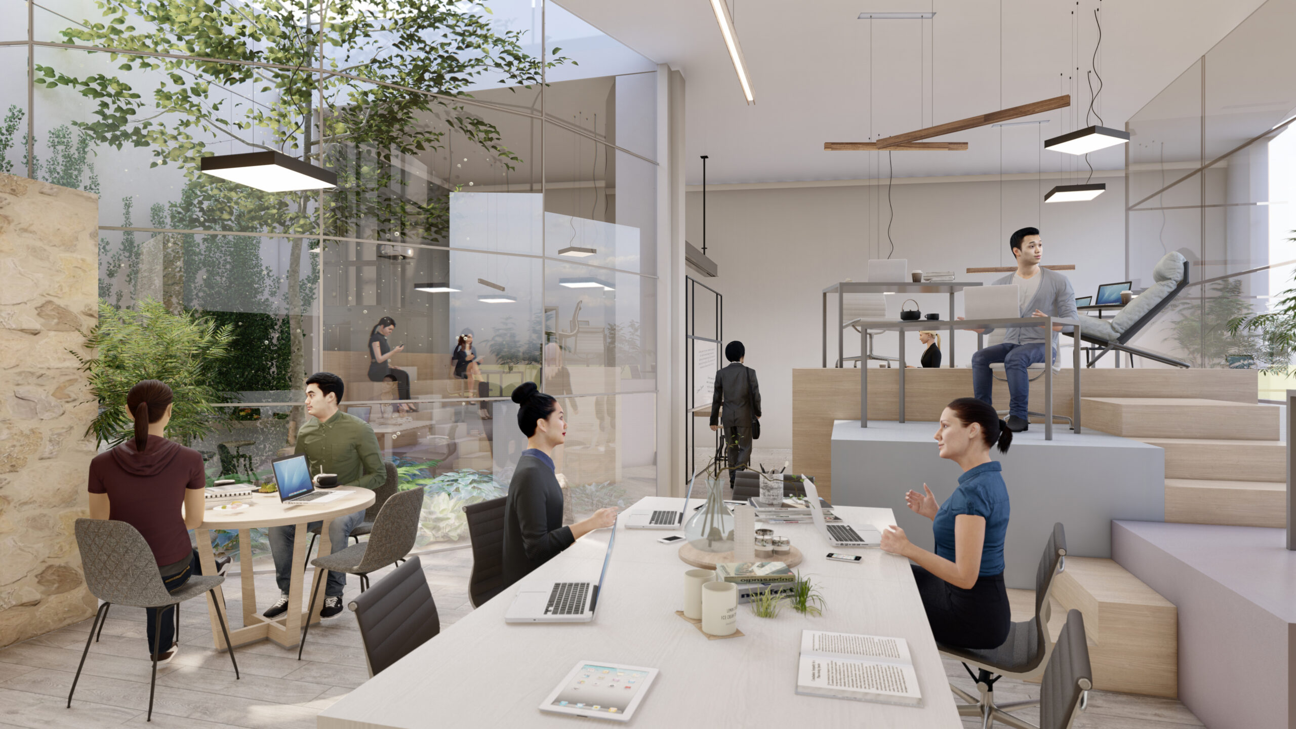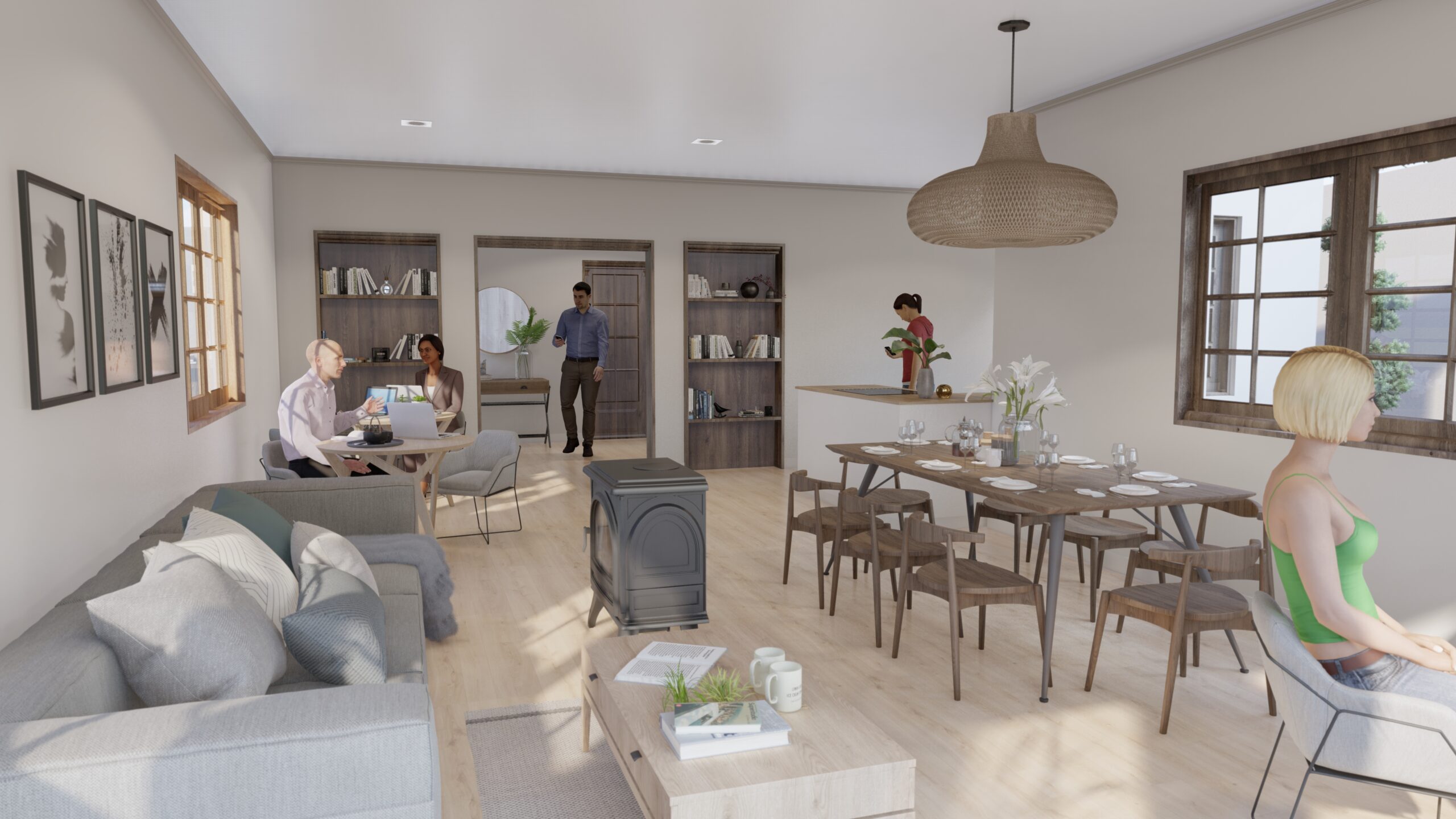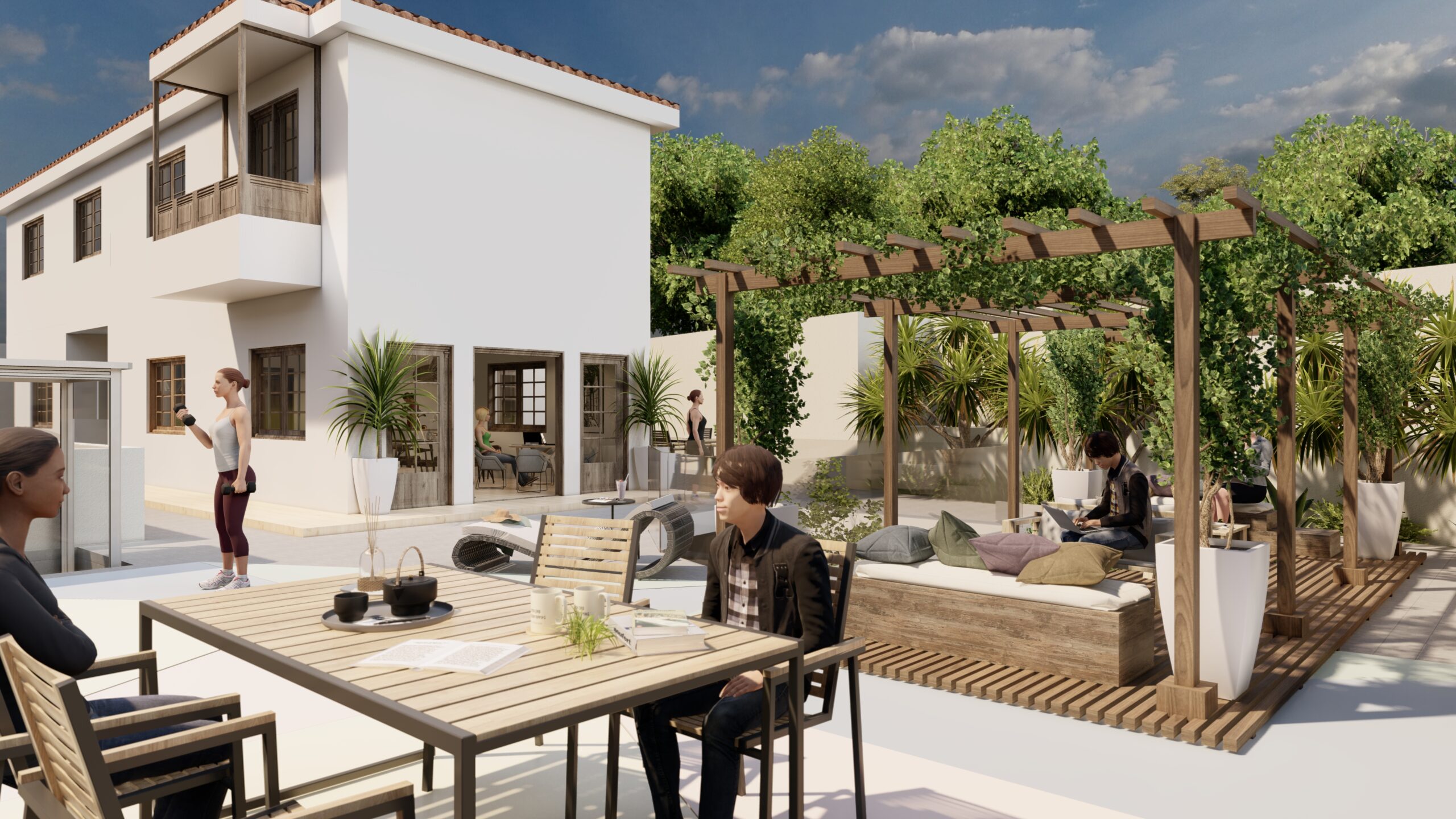 La vivienda familiar se convierte en espacios de comunidad, con un resultado de 9 habitaciones de diversos tamaños, conectados con las zonas comunes de forma sutil y con la intención de controlar los sonidos de cada ambiente. Se propone renaturalizar la parte exterior que recorre la edificación, y así se consigue aumentar el confort general. En el nivel inferior se propone un espacio multifuncional con formato coworking, de gran calidad, gracias a recibir luces y naturaleza desde la fachada principal y el gran patio central.